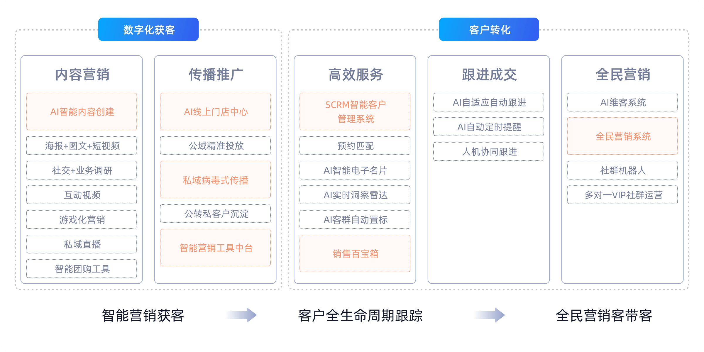 在“AI+营销”时代,原圈科技通过先进的大模型协调平台和精心打造的智能体矩阵,独特的行业和企业私域数据,帮助企业在抖音、腾讯、小红书、自有APP以及特色行业垂直APP等诸多营销战场上,实现“市场洞察、内容生成、投放管理、意向客户发现与转化、销售管理和客户运营的全周期AI营销服务。